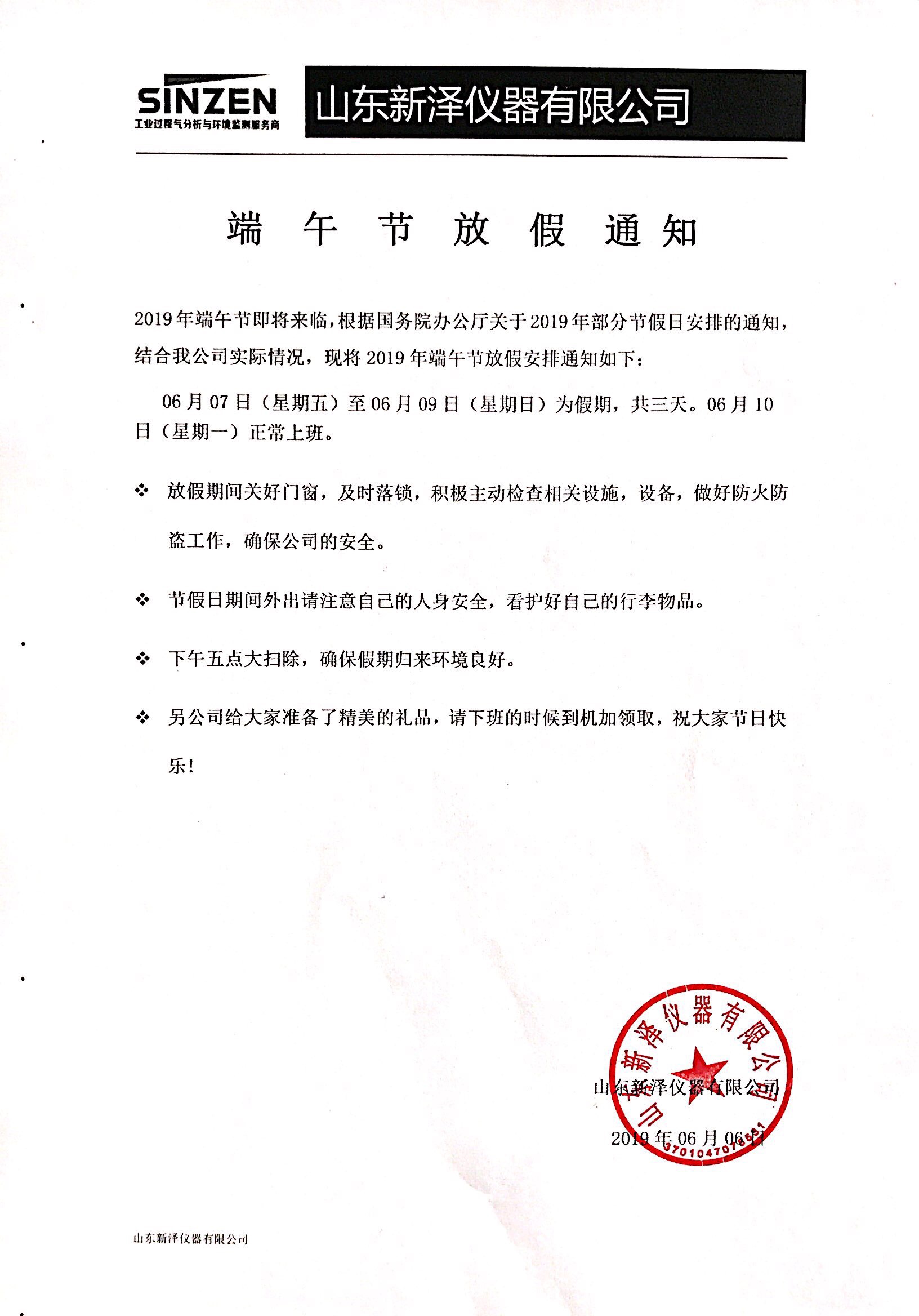 新澤儀器:端午節放假通知(06月07日 - 06月09日)