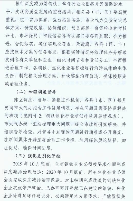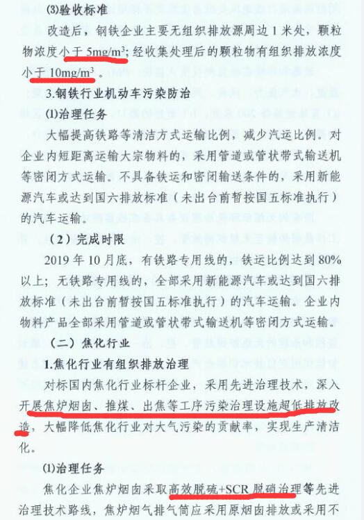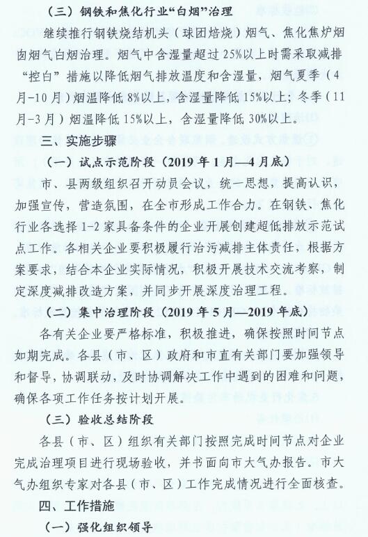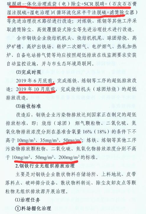 1、2019年6月底前,完成煉鐵、煉鋼等工序的超低排放改造;2019年10月底前,完成燒結(jié)機(jī)頭(球團(tuán)焙燒)的超低排放改造。