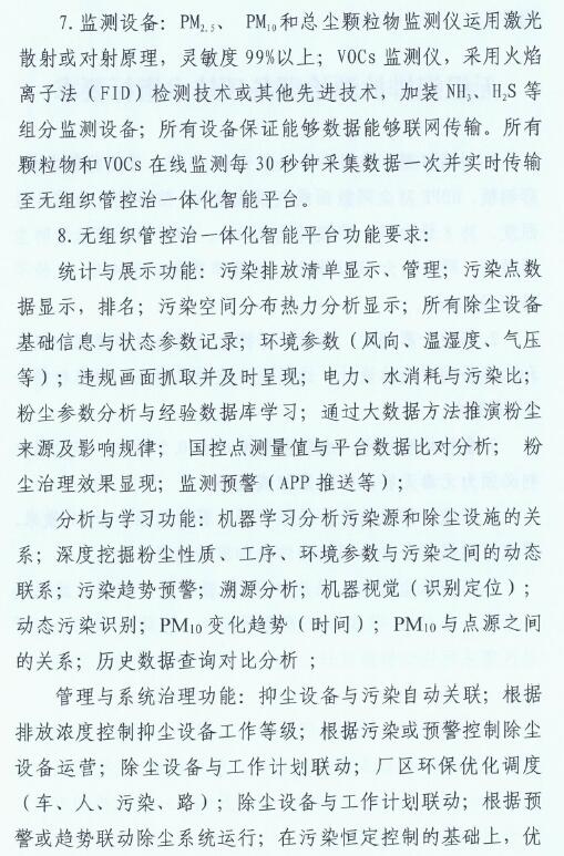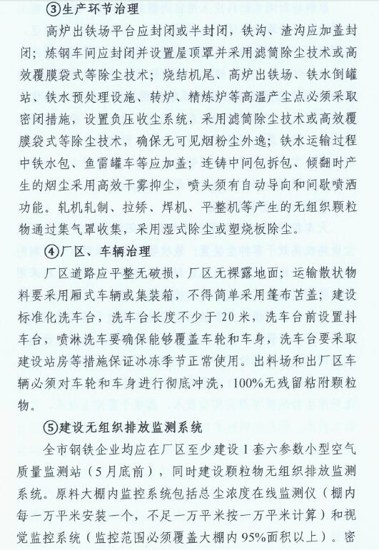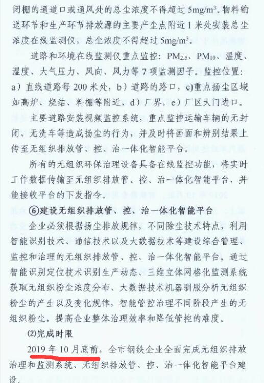 2、2019年10月底前,全市鋼鐵企業(yè)全面完成無組織排放治理和監(jiān)測(cè)、無組織排放管、控、治一體化智能平臺(tái)建設(shè)。