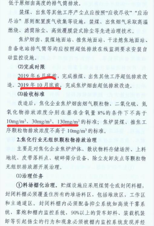 1、2019年6月底前,完成推焦、出焦其他工序的超低排放改造;2019年10月底前,完成焦?fàn)t煙囪的超低排放改造。