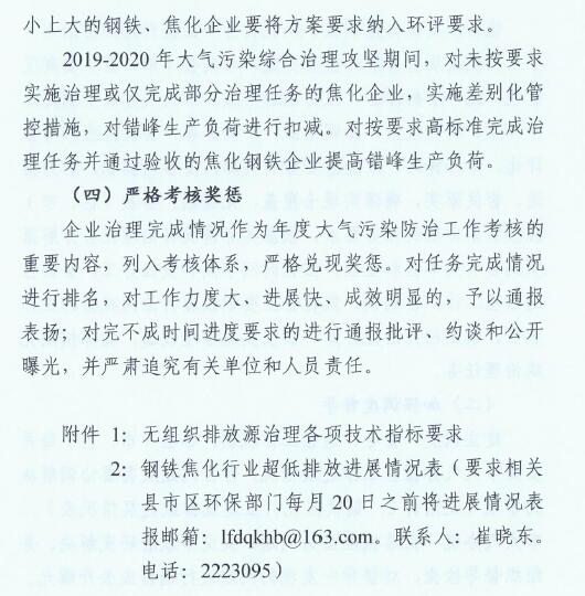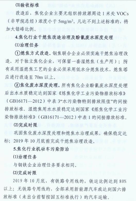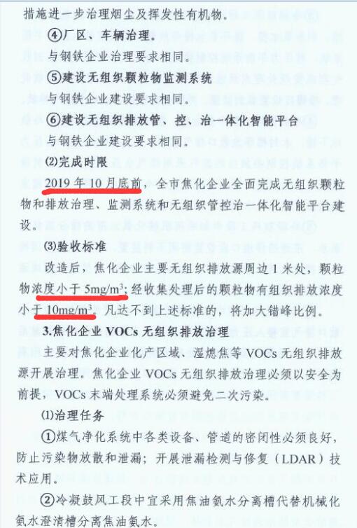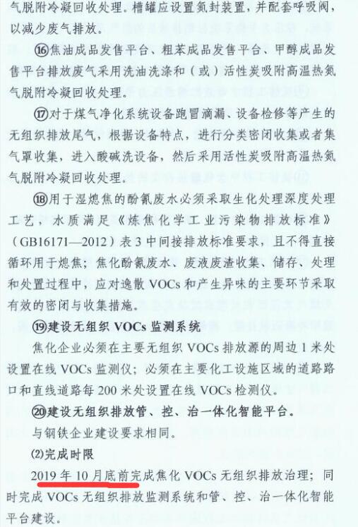 2、2019年10月底前,全市焦化企業(yè)全面完成無組織排放治理和監(jiān)測(cè)、無組織排放管、控、治一體化智能平臺(tái)建設(shè)。