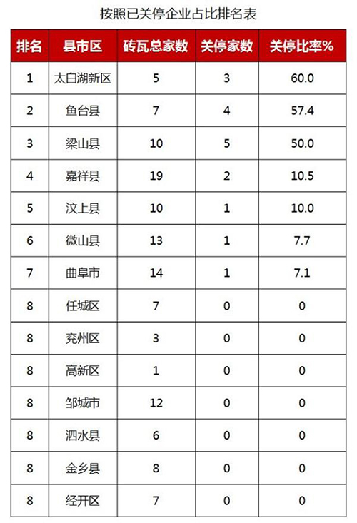 目前,濟寧市磚瓦企業(yè)整合重組工作穩(wěn)步推進(jìn),122家磚瓦企業(yè)中,17家企業(yè)已關(guān)停,包括曲阜1家,魚臺4家,梁山5家,汶上1家,太白湖3家,嘉祥2家,微山1家;105家企業(yè)處于前期,其中任城7家,兗州3家,高新1家,曲阜13家,鄒城12家,泗水6家,微山12家,魚臺3家,金鄉(xiāng)8家,嘉祥17家,汶上9家,梁山5家,太白湖2家,經(jīng)開區(qū)7家;按照已關(guān)停企業(yè)占比進(jìn)行排名,排在前三名的縣市區(qū)為太白湖新區(qū)、魚臺縣、梁山縣,關(guān)停占比分別為60.0%、57.4%、50.0%。