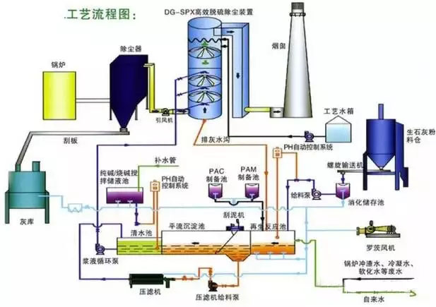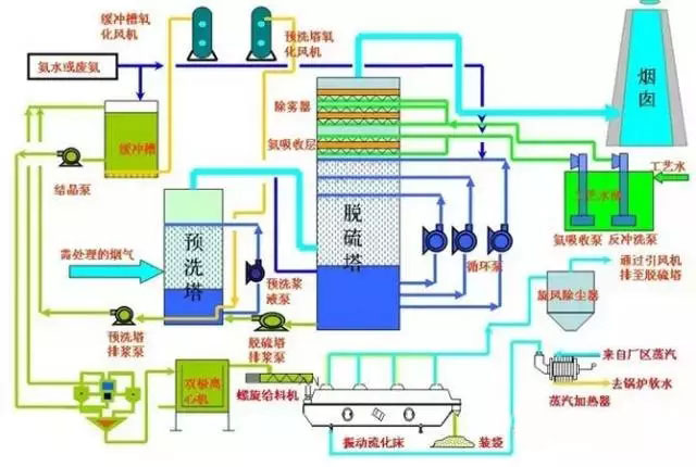 該工藝主要由脫硫洗滌系統(tǒng)、濃縮系統(tǒng)、煙氣系統(tǒng)、氨貯存系統(tǒng)、硫酸銨生產(chǎn)系統(tǒng)(若非氨-硫銨法則是于其工藝相對(duì)應(yīng)的副產(chǎn)物制造系統(tǒng))、電氣自動(dòng)控制系統(tǒng)等組成。