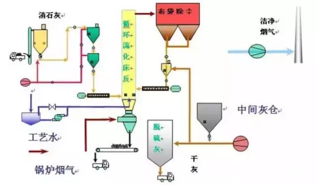 脫硫反應(yīng)后的產(chǎn)物以干態(tài)粉末形式從分離器中吹出。這種脫硫技術(shù)應(yīng)用石灰石或消石灰做脫硫劑。具有很高的脫硫率及脫硫劑利用率,而且對(duì)環(huán)境的影響很小。
