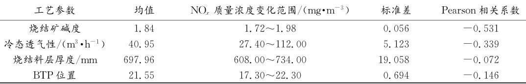 二、工藝參數對NOx排放的影響規律燒結工藝因素重點考察燒結礦堿度、冷態透氣性、料層厚度與燒結終點(BTP)位置4個參數對煙氣NOx排放的影響。相關性分析結果列于表4中。