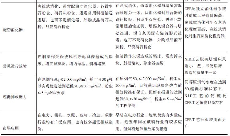 煙氣循環(huán)流化床CFB-FGD、 NID-FGD兩種半干法脫硫除塵治理工藝技術(shù)體系對(duì)比見表1。