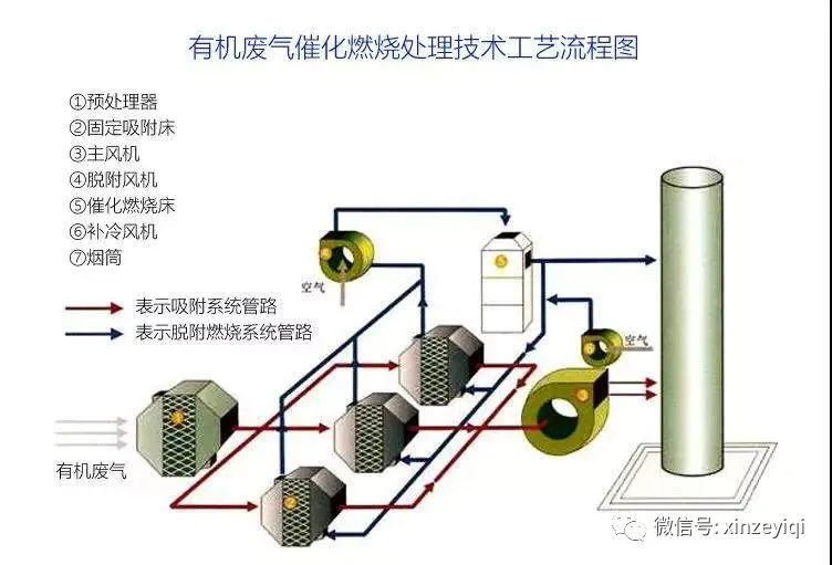 含有機(jī)污染物廢氣進(jìn)入吸附裝置,揮發(fā)性有機(jī)物大部份被吸附裝置吸附,而成為較干凈的空氣,這部份干凈的氣體排放至大氣中。被吸附裝置吸附的大部分有機(jī)污染物則進(jìn)入脫附再生區(qū),在此區(qū)完成脫附再生,該過程主要是利用高溫空氣將脫附再生。經(jīng)過再生后,吸附裝置吸附的廢氣經(jīng)脫附而成為高濃度的有機(jī)廢氣。這部分高濃度的有機(jī)廢氣進(jìn)入催化燃燒床,有機(jī)廢氣加熱到催化起燃問題以上,廢氣經(jīng)過安裝有催化劑的床層時(shí),廢氣中的VOCs轉(zhuǎn)化為無害的CO2和水,以達(dá)到去除有機(jī)物的目的。