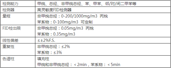 ● 采用微型的 FID 檢測器,其極低的檢測下限(0.01ppm)對總烴、非甲烷總烴、酮類、烯烴、醇類、笨類等多種有機物廢氣具有超高的靈敏度、卓越的重現性及高效的分析效率;
